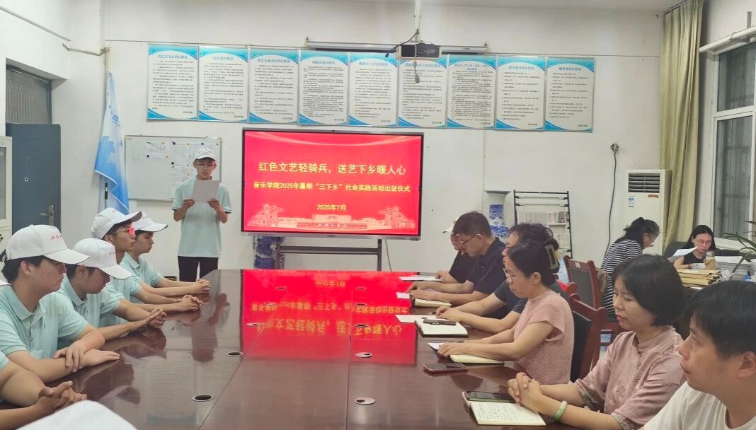 为认真学习贯彻习近平新时代中国特色社会主义思想,深入贯彻党的二十大和二十届二中、三中全会精神,全面贯彻习近平总书记关于青年工作的重要思想,贯彻落实习近平总书记在我省考察时重要讲话精神和关于河南工作的重要论述,聚焦“两高四着力”,广泛组织引领青年学生投身乡村和基层开展社会实践,直观体验党的创新理论在祖国大地的生动实践,在“行走的思政课”中感受中国式现代化的万千气象。2025年7月1日,音乐学院在艺术楼A105室举行“红色文艺轻骑兵,送艺下乡暖人心”2025年暑期“三下乡”社会实践团出征仪式。学院班子成员、全体辅导员及实践团全体成员出席,仪式由党委副书记姜星主持。