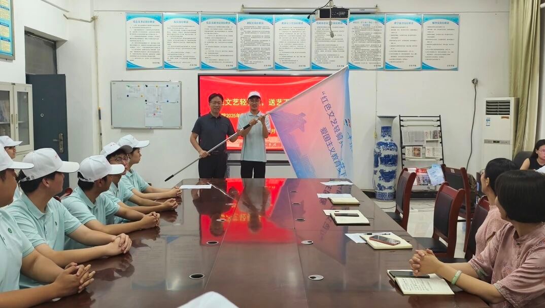 仪式最后,程志奎院长为“三下乡”社会实践团庄严授旗。鲜艳的队旗承载着重走红色足迹、传承红色基因的时代使命。随着队旗交接,实践团师生将满怀激情奔赴乡镇社区,以艺术传递温暖力量,奋力书写文化赋能乡村振兴新篇章。