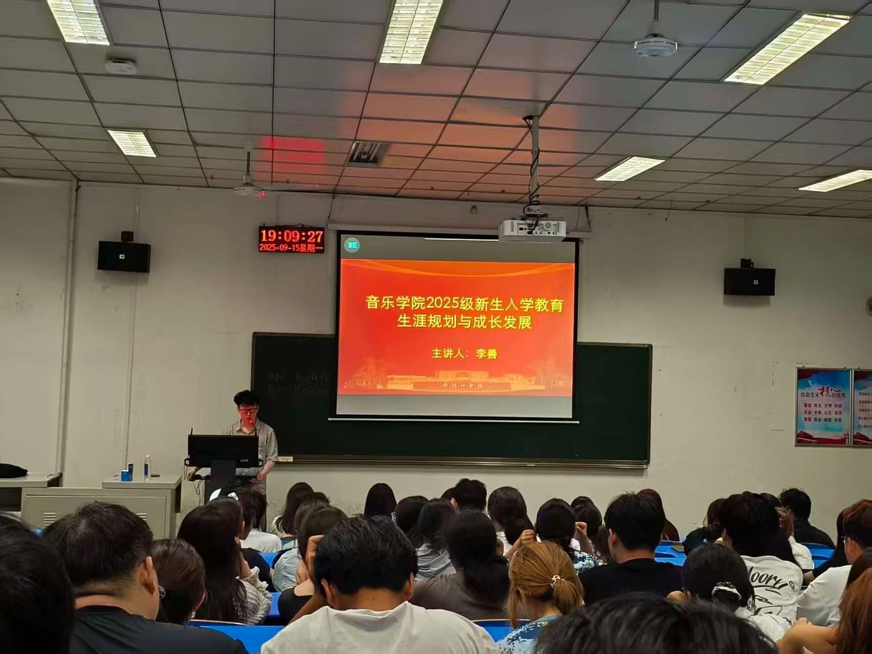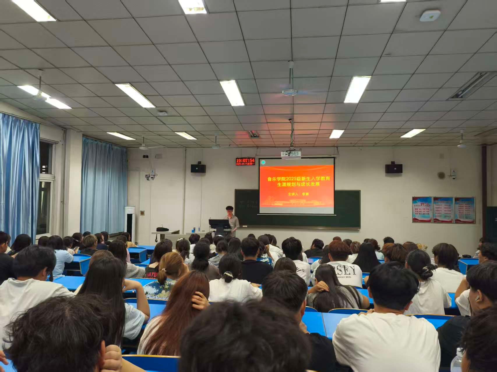 2025年9月15日晚,平顶山学院音乐学院特邀优秀学长李善,为2025级全体新生带来一场以“生涯规划与成长发展”为主题的入学教育讲座。这场充满温度与干货的分享,为初入校园的新生们拨开了成长迷雾,点亮了逐梦灯塔。