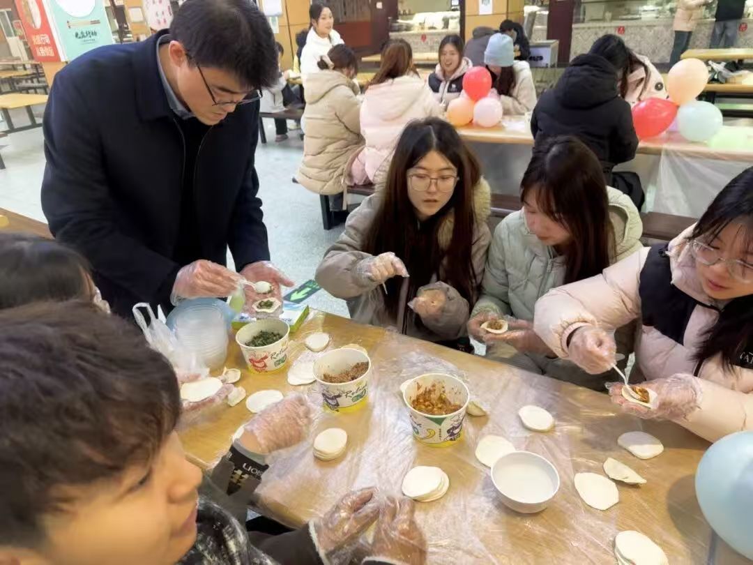 包饺子过程中,学院党委副书记姜星耐心指导同学们捏出规整的饺子,同学们则发挥创意,包出元宝、花朵等各式造型,一个个独具匠心的饺子在指尖诞生,满载心意与巧思。