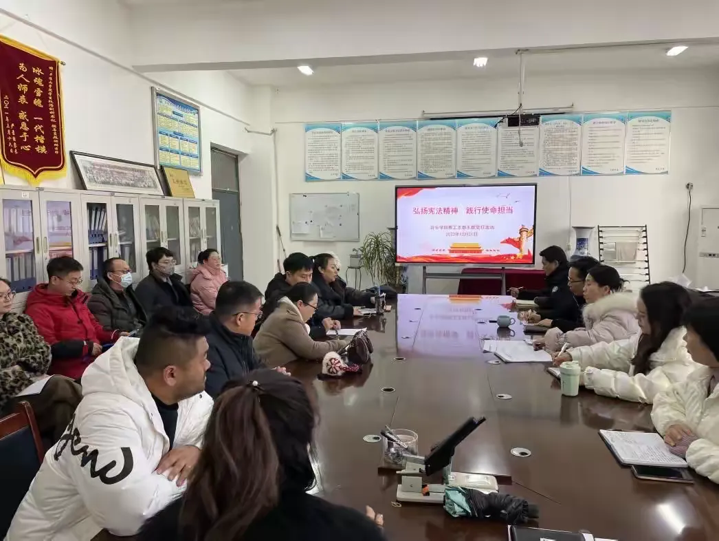 2023年12月21日下午,音乐学院教工支部在艺术楼105办公室开展以“弘扬宪法精神,践行使命担当”为主题的党日活动,活动由党委副书记潘刻科主持,全体教工党员参加。