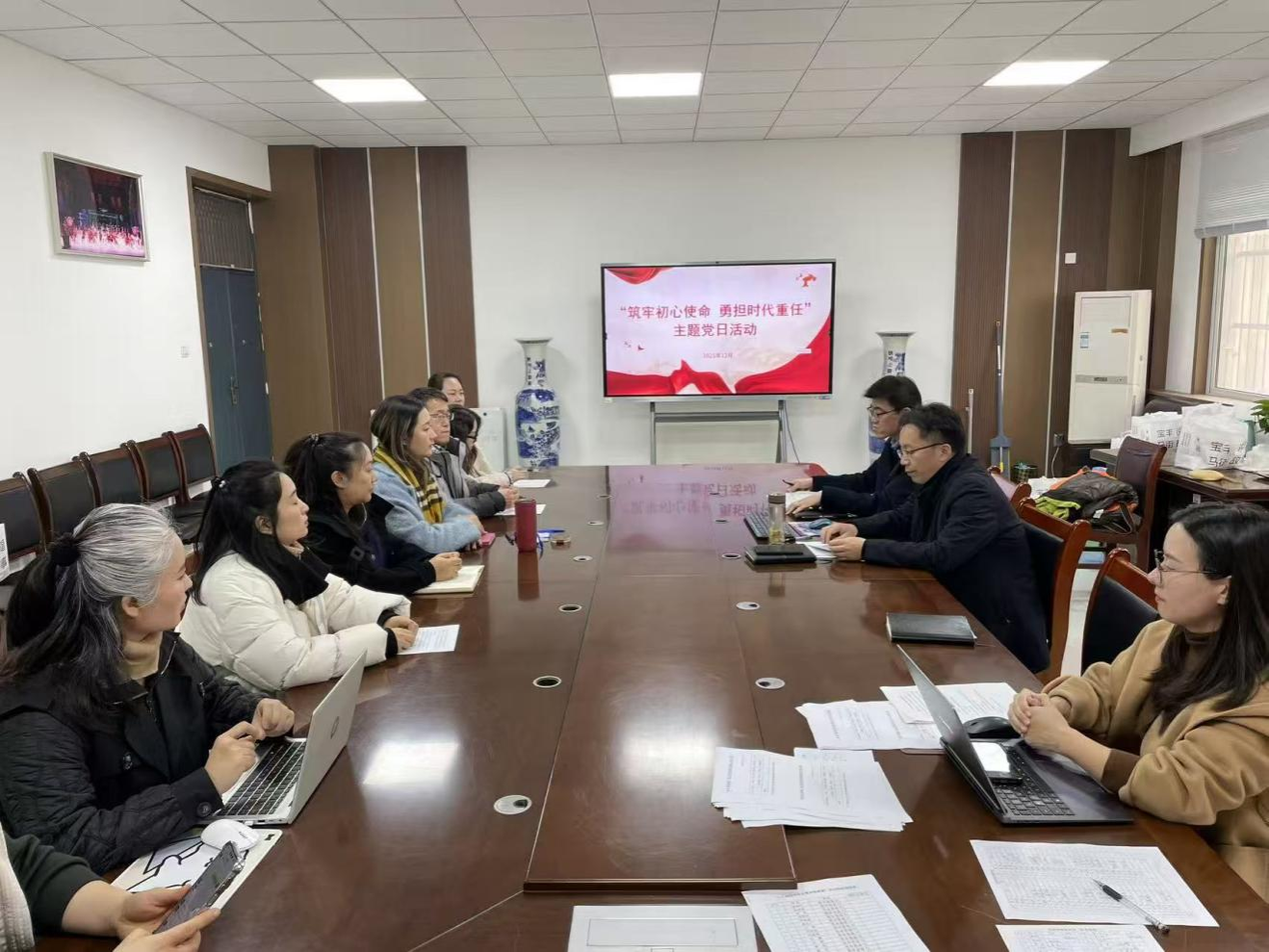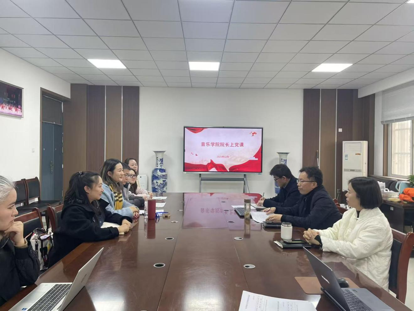 2025年12月18日下午,音乐学院教工党支部在艺术楼A105会议室开展以“筑牢初心使命 勇担时代重任”为主题的党日活动。活动由教工党支部书记郭琳琳主持,全体教工党员参加了本次活动。